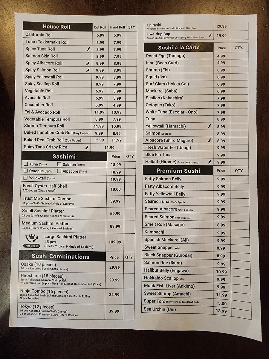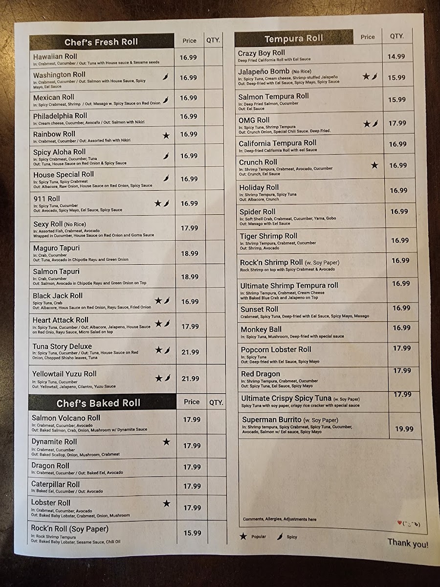 In: Spicy Tuna, Spicy CrabmeatOut: Albacore, Raw Onion, House Sauce on Red Onion, Spicy Sauce